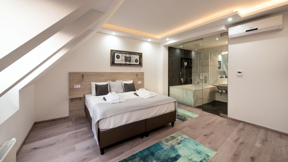 Die Hauptattraktion unseres inneren zweigeschossigen, geschmackvoll eingerichteten Appartements ist die Badewanne/ Dusche für 2 Personen, mit der es sich von unseren anderen Zimmern auszeichnet. Die beste Wahl für Paare.